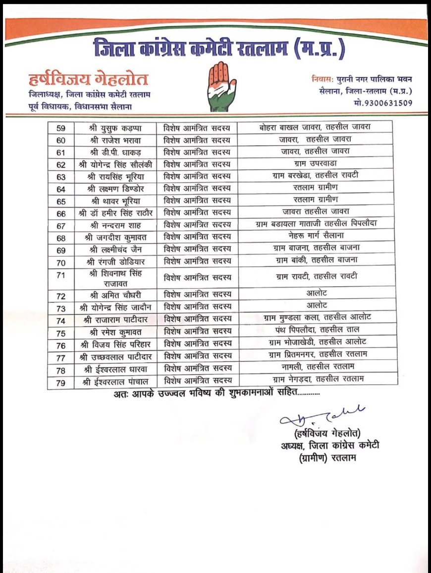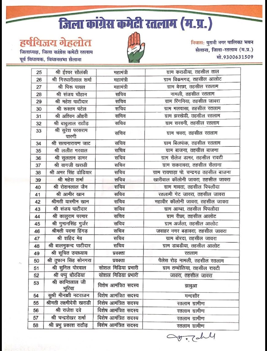 *पाटीदार महासचिव, सिंह उपाध्यक्ष, कांतिलाल भूरिया, मीनाक्षी नटराजन के नामों सहित रतलाम जिला कांग्रेस कार्यकारिणी घोषित*