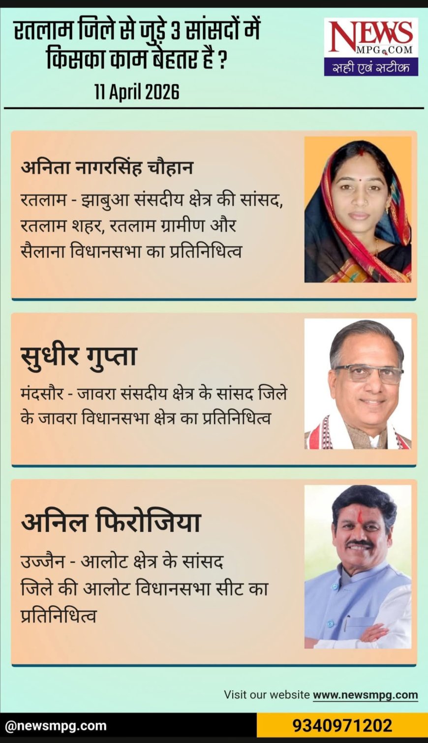 रतलाम@newsmpg। रतलाम जिला देश के चुनिंदा जिलों में शुमार है जहां देश के सबसे बड़े सीधे निर्वाचित पद 'सांसद' के रूप में एक या दो नहीं बल्कि तीन प्रतिनिधि मिले हैं। परंतु तीनों ही सांसदों की कार्यशैली और जनता से जुड़ाव को लेकर जनता की राय बेहद अलहदा है।