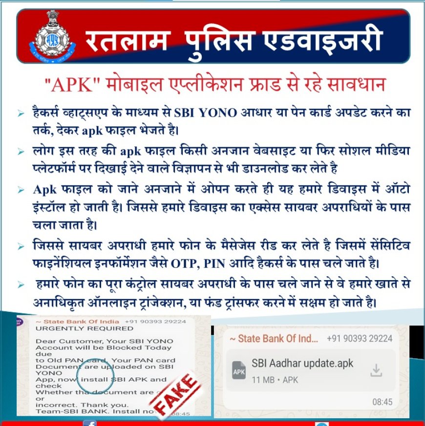 रतलाम@NEWSMPG। साइबर फ्रॉड करने के लिए आपराधी नए- नए तरीके ढ़ूढ़ रहे हैं। एसबीआई योनो अपडेट करने, आधार अपडेशन से लेकर परीचितों के नंबर से डाउनलोड तक का उपयोग करके अपराधी लोगों को ठग रहे हैं। रतलाम एसपी अमित कुमार के निर्देशन में रतलाम पुलिस ने लोगों को एपीके एप्लीकेशन से बचने के लिए नई एडवाईजरी जारी है।